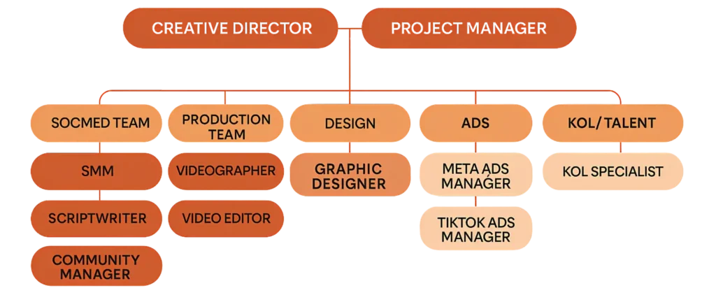 Bukan freelancer lepas, tapi tim solid yang benar-benar bekerja layaknya bagian internal dari brand kamu. Kami menyediakan struktur tim lengkap.